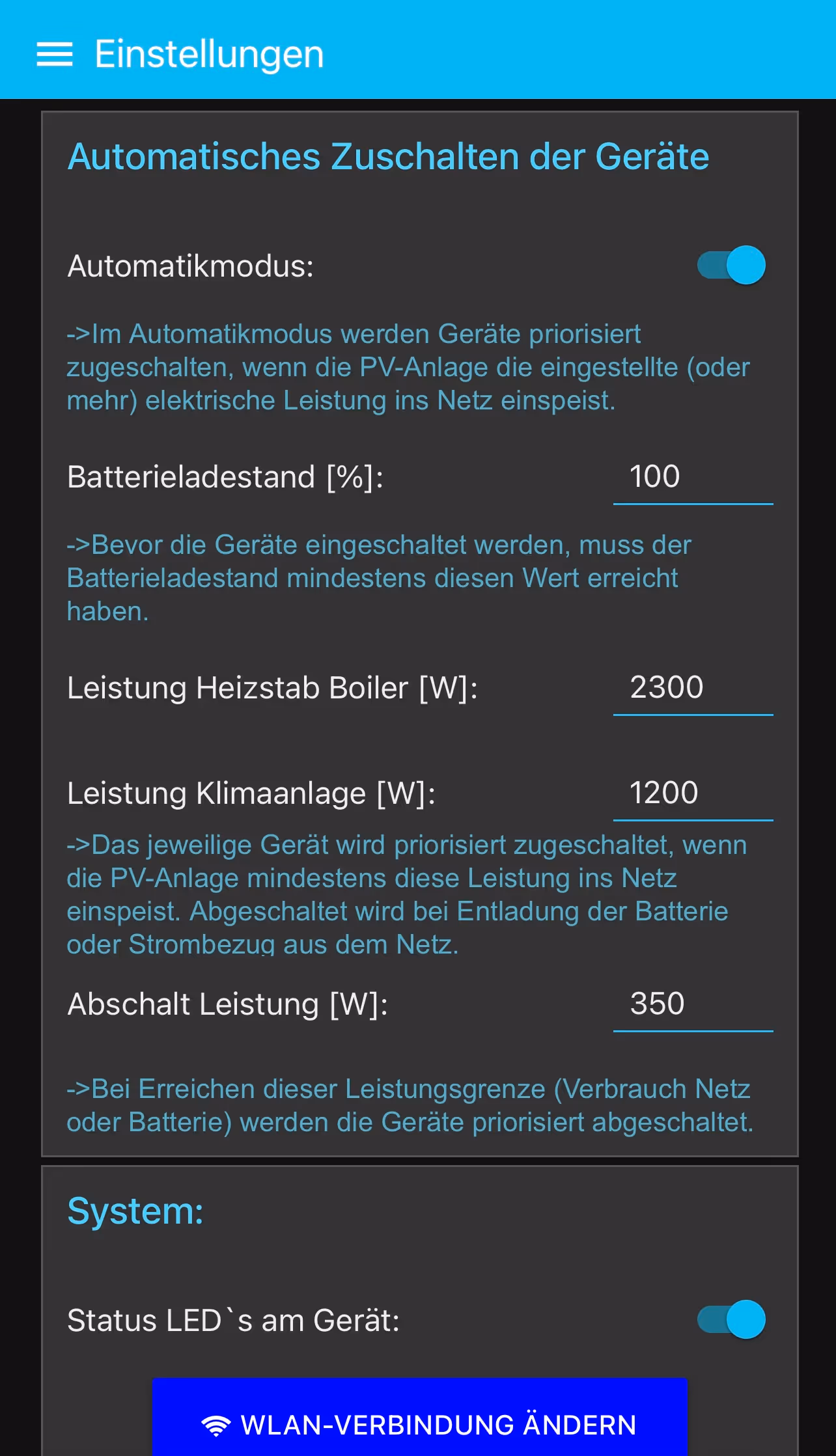 - Zuschaltschwellen (z. B. ab 2000 W Überschuss) können individuell pro Gerät konfiguriert werden.